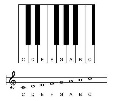 每个白键刚好对应C大调音阶中的音。白键之间有的紧紧相邻,有的相隔一个黑键。 挨在一起的白键之间相隔一个半音;挨在一起的黑白键也相隔一个半音,因此被黑键分开的 两个白键相隔一个全音。五线谱详见五线谱, 识谱只能靠多练,简而言之: